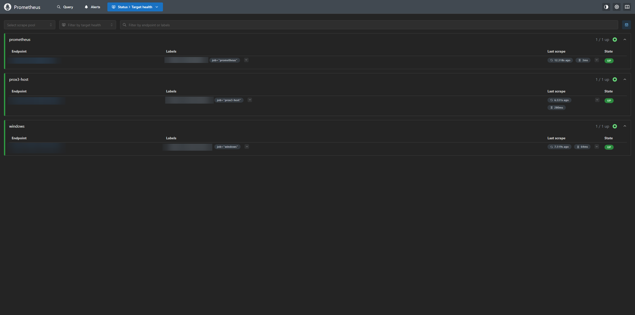 Il est impératif de valider l'état de santé des points de collecte en accédant à l'interface de Prometheus à l'adresse suivante : http://<IP_SERVEUR>:9090/targets. Les cibles doivent présenter le statut UP (indiqué en vert).