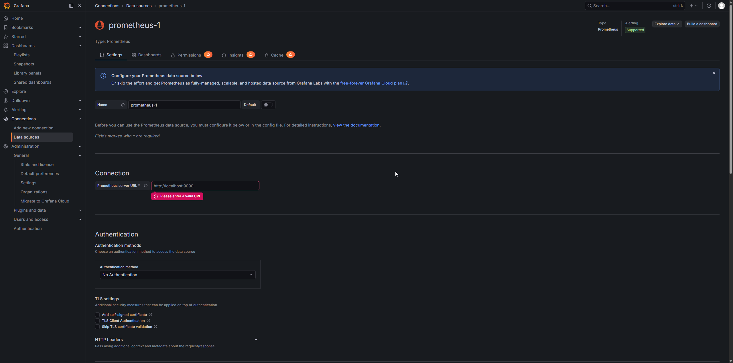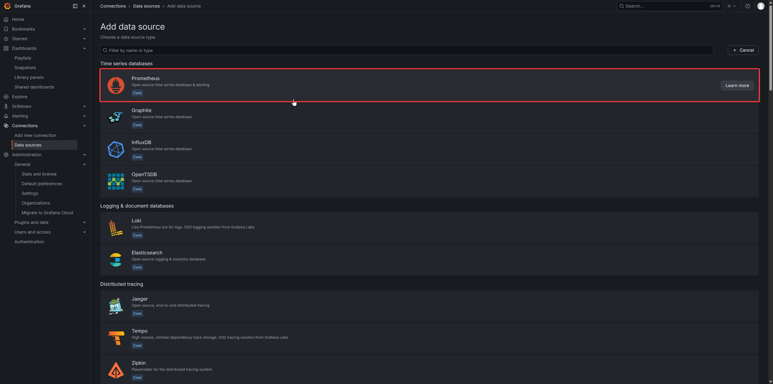 on ajoute Prometheus en tant que nouvelle source de données (Data source) pour relier les deux services.