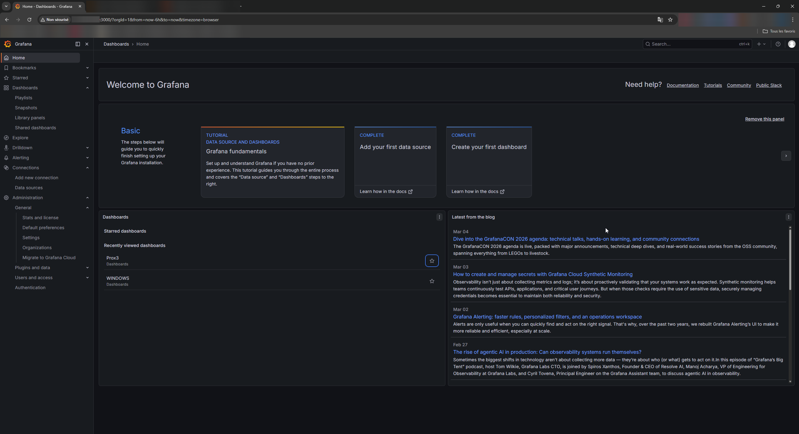 Aperçu de l'interface d'accueil de Grafana lors de la première connexion sur le port 3000